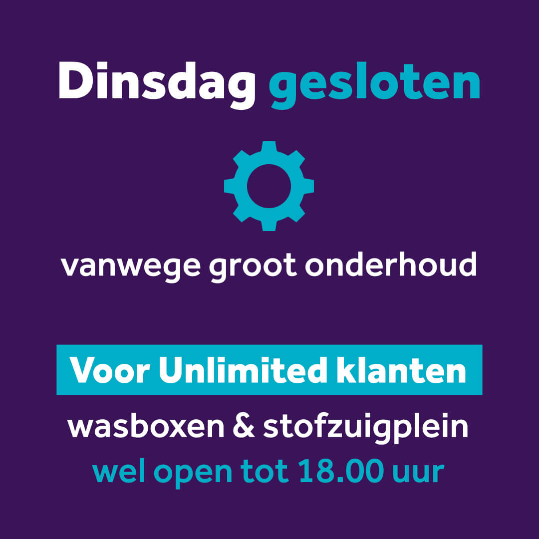 Het onbeperkt wassen is mogelijk zolang iedereen er verstandig en redelijk mee omgaat. Bij drukte en wachtende klanten graag de auto wassen en de wasbox dan verlaten. Voor het stofzuigen en drogen van de auto is ruimte genoeg op ons terrein. Wil je overdekt verder om je auto te verwennen? Vraag dan één van onze medewerkers om je te begeleiden naar de baan direct naast de wasstraat. Bij drukte in de wasstraat is het niet toegestaan om tegen het verkeer in de stofzuighal in te rijden.